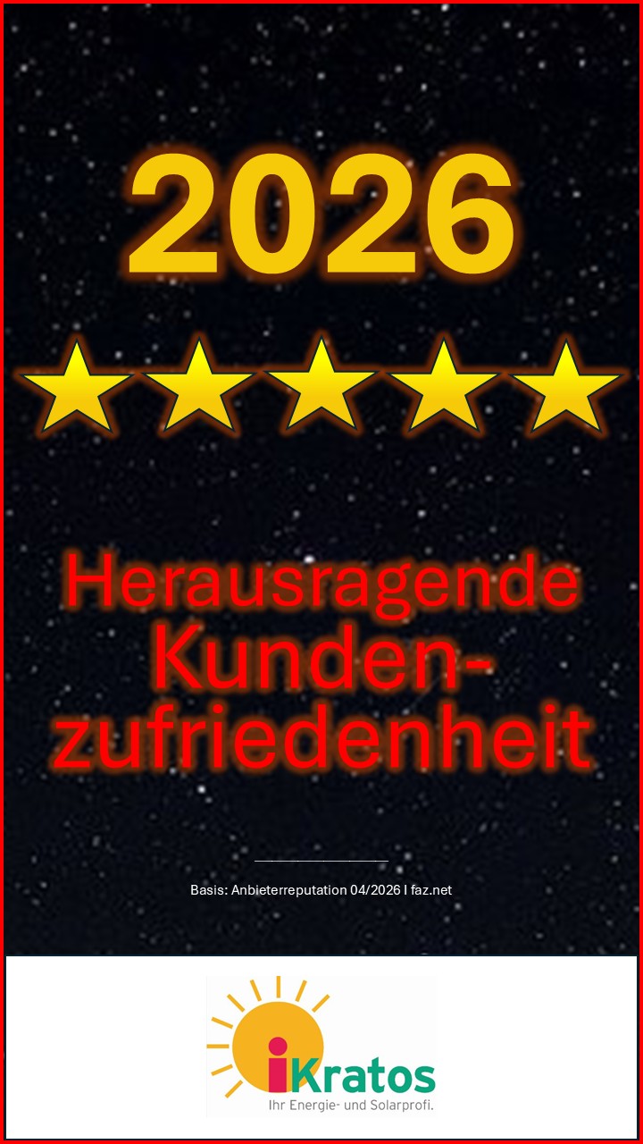 Hohe Beratungsqualität, verlässlicher Service und nachhaltige Kundennähe: Die iKratos Solar- und Energietechnik GmbH wurde aktuell bereits zum zweiten Mal mit dem begehrten Siegel „Herausragende Kundenzufriedenheit 2026“ ausgezeichnet. Die Studie, die jährlich vom renommierten F.A.Z.-Institut in Zusammenarbeit mit dem Analysehaus ServiceValue durchgeführt wird, bestätigt dem oberfränkischen Solarspezialisten Spitzenwerte in der Kundenbewertung.