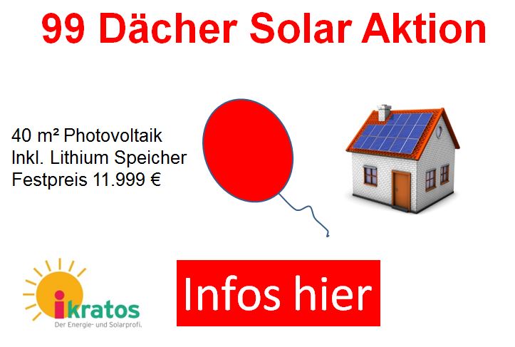 ikratos einer der führenden Firmen im Landkreis Forchheim ist Initiator dieser 99-Dächer-Aktion. Seien Sie mit dabei – setzen Sie auf erneuerbare Energien im eigenen Haus. Für nur 11.999 Euro netto bekommen Sie Ihre PV-Anlage-mit Lithium-Speicher aufs Dach – versprochen. Und … es ist einfacher als Sie denken – allerdings – die 99-Dächer-Aktion ist zeitlich limitiert.