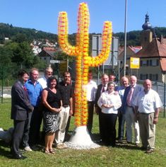 wurde das 3 Meter große Kunstwerk vom Erlanger Künstler Dieter Erhard Als Vorbild diente ihm ein Saguaro Kaktus. In der Natur ein perfekter Speicher für Wasser und Sonnenenergie. Oftmals werden sie 250 Jahre alt. Circa 2.200 Plexiglasteilchen hat der Künstler auf Stahlstäben aufgereiht und zum Kaktus geformt. Das verwendete sogenannte “Lisa Material” (Lichtsammelmaterial), erlaubt Licht nur mit 15% durchzufließen. Darum leuchten dann die Schnittkanten beim Austritt der restlichen 85 % Lichtanteile. Erhard will mit seiner Arbeit den Betrachter dazu anregen, mehr über Speicherlösungen nachzudenken und sich dabei mehr an der Natur zu orientieren. Die Idee zu diesem neuen iKratos Firmen Symbol, entstand auf einer gemeinsamen Reise mit den Geschäftsführern Willi und Ulrike Harhammer und mit dem Künstler Erhard im Frühjahr dieses Jahres in Texas, USA. Harhammer und Erhard realisierten schon zusammen den “Igensdorfer Planetenweg”. Da wirkten bereits guatemaltekische Künstler mit. Deutsche Künstler reisten dann nach Guatemala und bauten vor Ort mit Guatemalteken einen Schwesterplanetenweg. Diese sind heute auf Fotos neben den Igensdorfer Stationen abgebildet. Sozusagen eine Pflichtkür für den Botschafter und seine Frau, die extra aus Berlin angereist sind den in Deutschland einzigartigen doppelt dargestellten Planetenweg zu besuchen. Außerdem möchte sich der Botschafter bei der iKratos GmbH für die großzügige Spende einer Solaranlage für das soziale Projekt Centro Madre Teresa (ein Zentrum für unterernährte Kinder) in dem Ort San Miguel Duneas in Guatemala bedanken. Zu den Ehrengästen zählen: Herr Landrat Glauber FO Herr Landrat Irlinger ERH Herr Bürgermeister Braun Weißenohe Herr Bürgermeister Wolf, Vertretung Herr Nekolla, stellvertretender Landrat Manfred Bachmeier, Willi Harhammer Geschäftsführer von iKratos, Ulrike Harhammer, Michael Pickel, Geschäftsführer von Mercedes Erlangen, Thorsten Glauber Mitglied des Landrats, Klaus-Peter Päuser, ehemaliger Vorsitzender des Lions Club Eckental Heroldsberg, Herr Bürgermeister Rast Igensdorf Herr Zeiß (ehemaliger Bürgermeister) Igensdorf, Webseite Künstler: www.dieter-erhard.com Website für den Standort des Solar Kaktus: www.iKratos.de